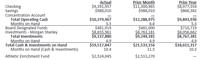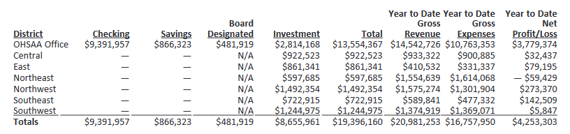 Senior Director of Finance Laura Vermilya provided the financial report through April. The OHSAA currently has $10.3 million of operating cash; $9.1 million in investments and board designated funds, and $19.5 million in total funds. The latter amount can cover 10.4 months of expenses, and she projects that figure to be at nine months when the fiscal year ends July 31. Ms. Vermilya said the year to date expenses for the fiscal year were better than budget and revenues were above budget. The financial report is summarized as follows: