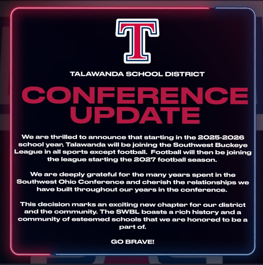 (7-24-24) Talawanda today announced that they would be leaving the Southwest Ohio Conference and will join the Southwestern Buckeye League in all sports except football in 2025-26 and will start in football in 2027. The Braves will be the 13th member…no announcement of what division they will compete in.