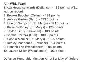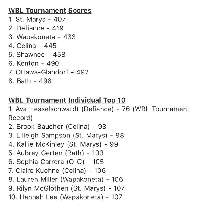 Defiance Sophomore Ava Hesselschwardt was the tournament medalist shooting a WBL tournament record 76. She was the top-point getter maxing out with a 132 points during the dual meets and the tournament, a WBL record.