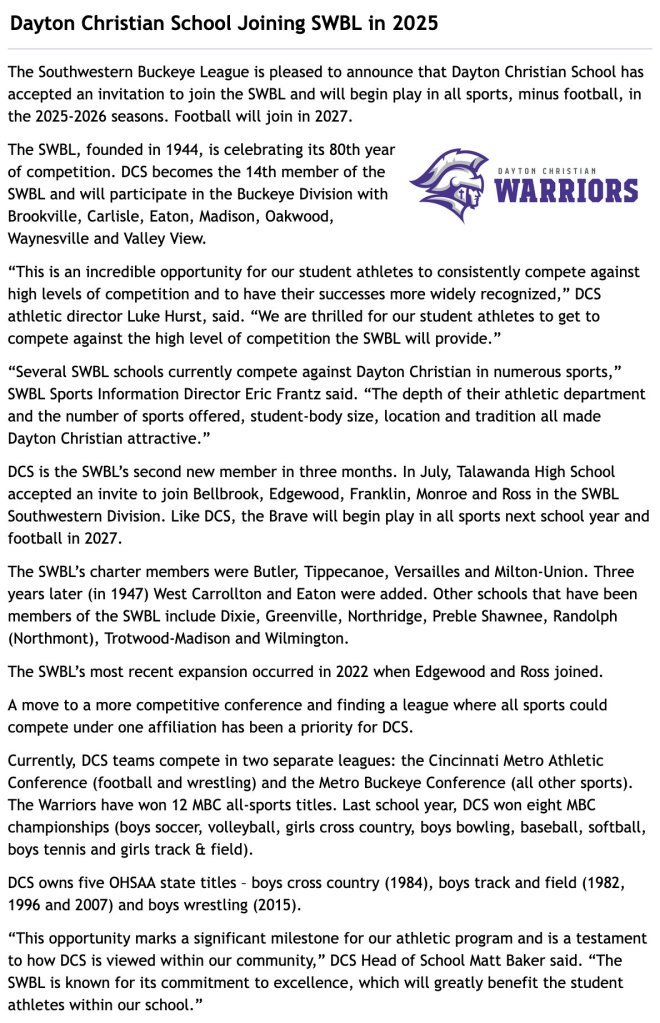 (10-1-24) Dayton Christian announced today that they will join the Southwestern Buckeye League in 2025-26 in all sports but football…football will join in 2027.