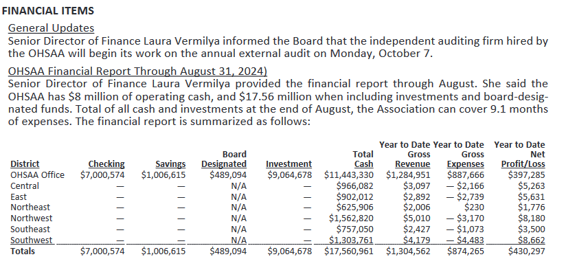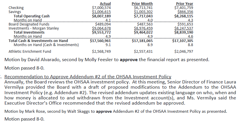 The OHSAA has invested in savings account of $1,006,615, checking of $7,000,574 and invested with Morgan Stanley of $9,064,678, $489,094. Year to date profit of $430,297.