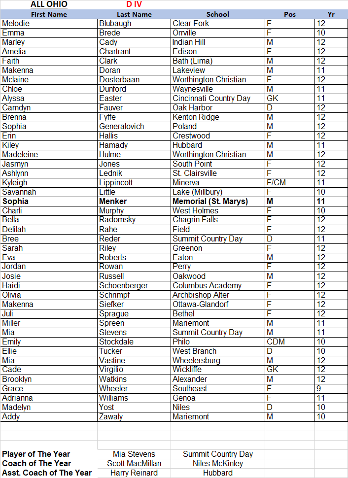 (11-13-24) Three Stateline girls soccer players have been named to the Ohio Scholastic Soccer Coaches Association (OSSCA) All-Ohio teams.
