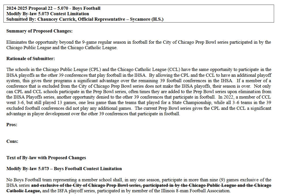 (11-25-24) An IHSA by-law proposal that would have eliminated the Chicago Prep Football game was not advanced to member schools to vote on. The IHSA released the list of 9 of the 26 proposals that members will now vote on.