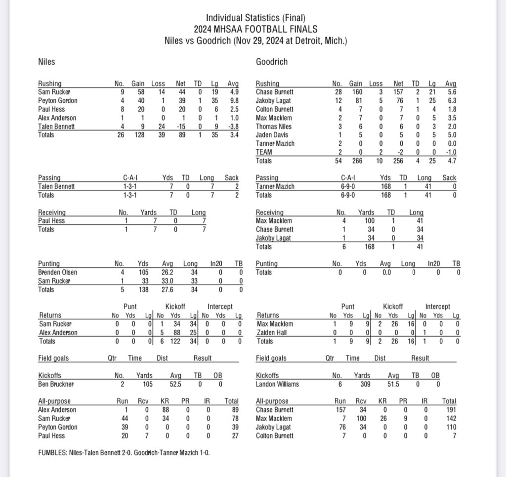(11-30-24) Yesterday at Ford Field in the MHSSA Division 4 State Football Championship Goodrich (13-1) picked up a 35-6 victory over Niles.