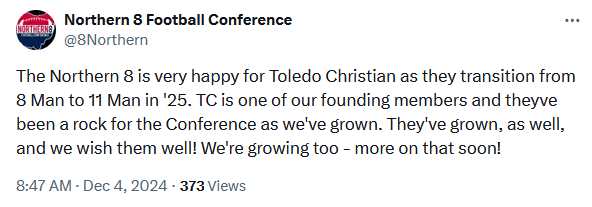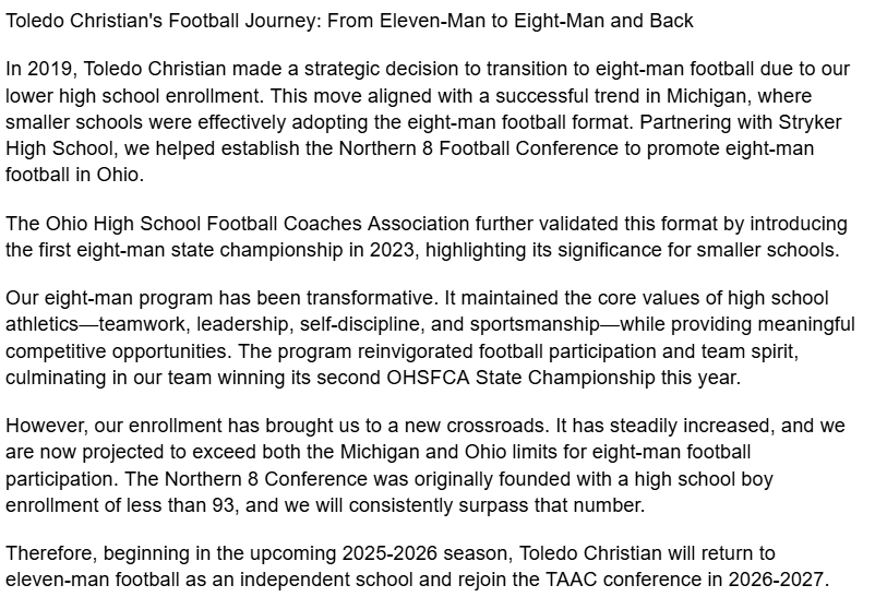 (12-4-24) Toledo Christian announced today that they will leave 8-man football and return to 11-man football next season as an independent and will rejoin the Toledo Area Athletic Conference the following season.