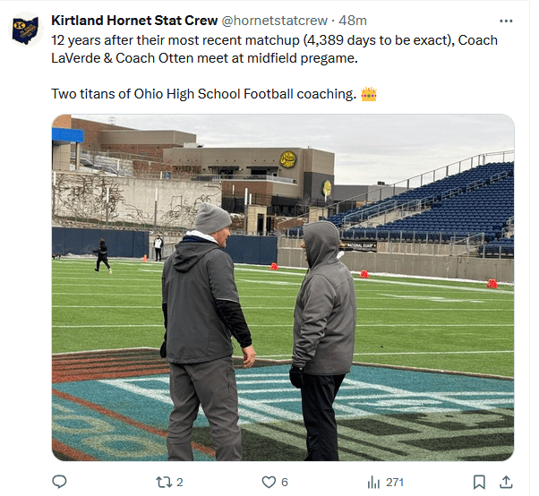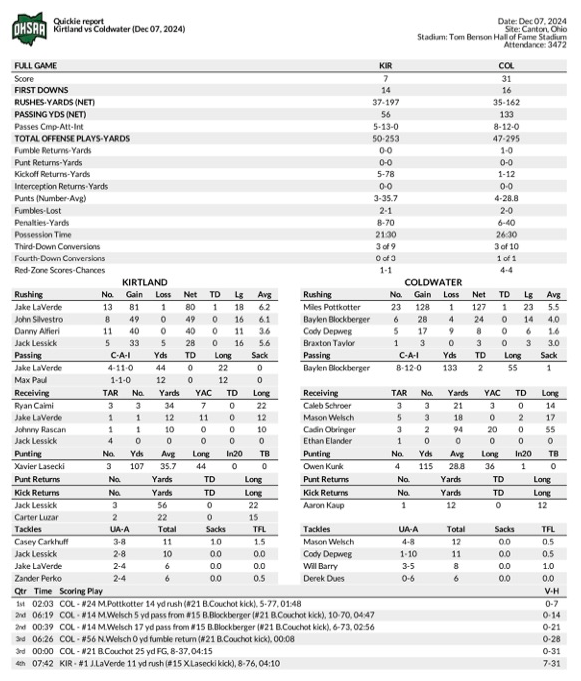 (12-7-24) Kirtland and Coldwater are Ohio’s two best small-school programs not named Marion Local. Entering today’s D VI Championship games the Hornets and the Cavaliers had both won 7 state championships and had 13 title game appearances in the last two decades.