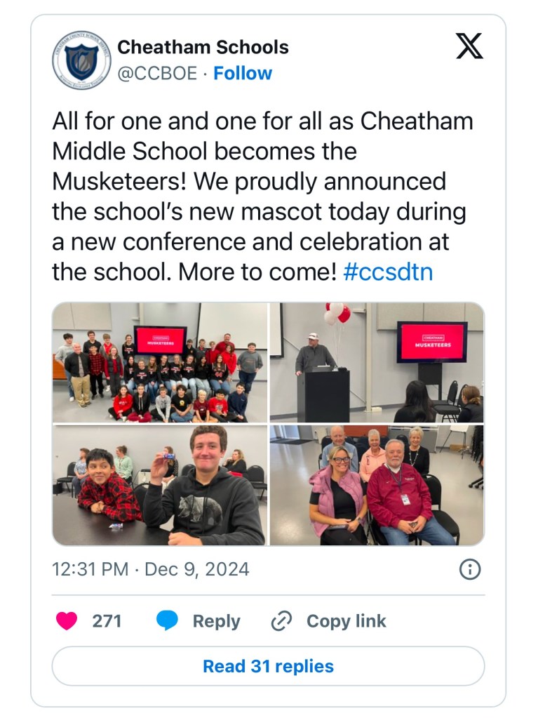 (12-11-24) On Monday, Cheatham (Tn) Middle School announced the school’s new mascot – Musketeer.