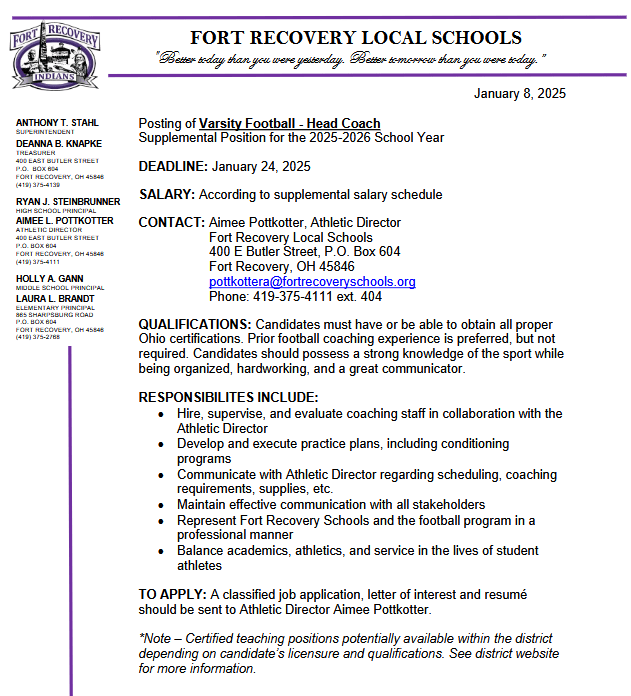Fort Recovery, OH (1-8-25) – Fort Recovery Local Schools is excited to announce the vacancy for our head varsity football coach position. We are seeking an enthusiastic, dedicated, and qualified individual to fill this position and the ideal candidate will have a passion for coaching, a commitment to student-athlete development, and the ability to lead a competitive high school football program.