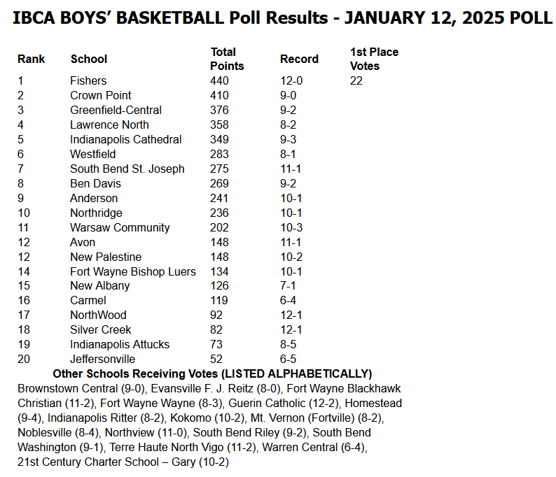 (1-12-25) Only two teams in the IBCA Boys Basketball Poll Top 20 remain without a loss this season…#1 Fishers (12-0), who picked up all of the 22 1st place votes, and #2 Crown Point (9-0).