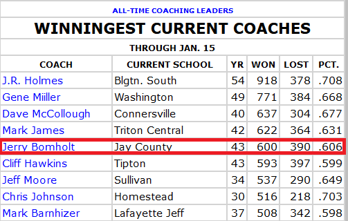 Bomholt in 43 years of coaching has a 600-390 record. In terms of wins, he is #5 among active Indiana high school boys basketball coaches .