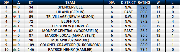 Northwest Ohio continues to maintain their grip on the top of the Division VI rankings. Spencerville beat a talented Arlington team, 47-27, over the weekend. Convoy Crestview extended their winning streak to 10 with wins over Allen East and Fort Recovery. Undefeated Patrick Henry debuted in the top 10 with a trio over double-digit wins over 12-3 Miller City, Bryan, and Leipsic.