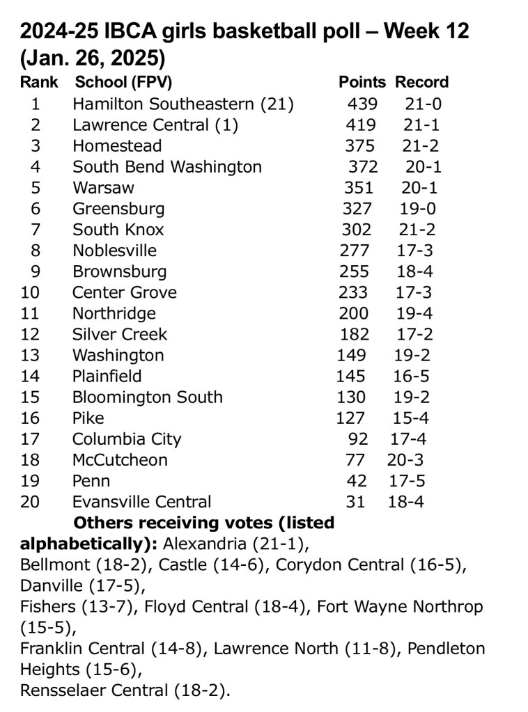 Below are results of the IBCA girls’ basketball poll for Week 12 of the 2024-25 season (Jan. 26, 2025). The IBCA poll is a “non-class” poll, where teams are voted to a Top 20 regardless of school classification.