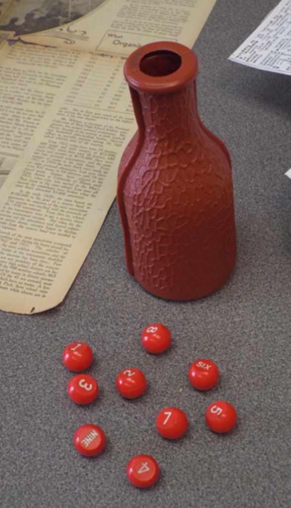 The original peas and leather bottle are now on display at the IHSA Peak Performance Center at the Peoria Riverfront Museum. A modern, plastic bottle (above)rolls the official peas these days.