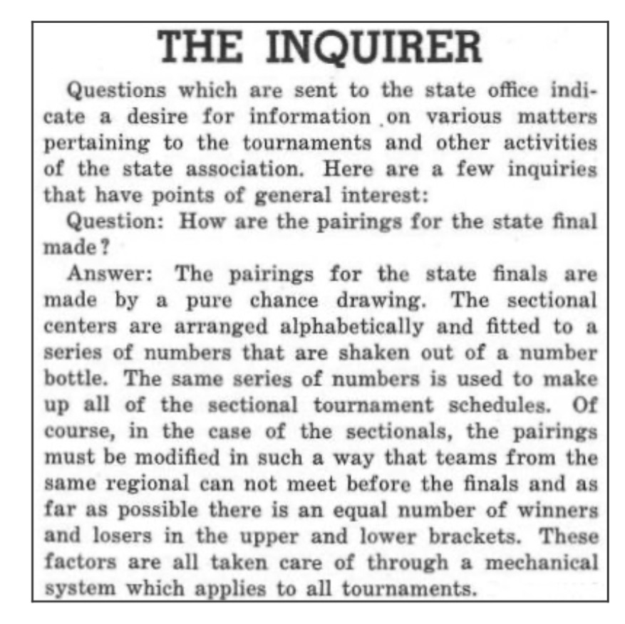 Traditionally, the pairings are made by ordering the sites that feed into the state finals in alphabetical order and numbering them. Then numbered peas are drawn from a bottle. The number on the first pea drawn represents the site whose winner will occupy the first position on the bracket, and so on. “The rolling of the peas” dates back to at least 1940.