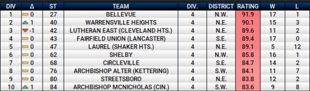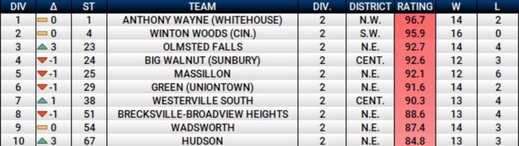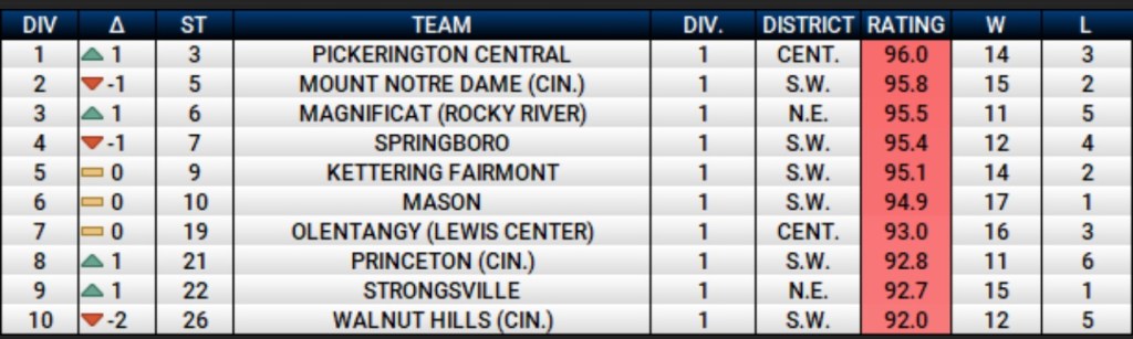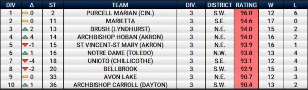 Despite the loss, Purcell Marian holds the top spot in D III thanks to the challenging strength of schedule in the state. After the Cavaliers, it’s a hodgepodge for the silver medal in D III. Marietta remains undefeated while northeast Ohio teams Brush and Hoban climb up the rankings with big wins over the past week. Even Carroll makes an appearance in the top 10, riding an 8-game winning streak.