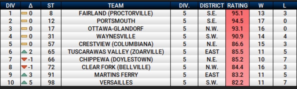 Like one division above, the top 5 all stay the same in D VI. Patrick Henry climbed to just outside the top 5 thanks to a win over 13-win Wauseon on Thursday. Marion Local jumps into the top 10 as they get ready to face St. Henry on Thursday with a clear path to an outright MAC championship on the line. The Flyers host Minster, another team in the D VI top 10, on Saturday.