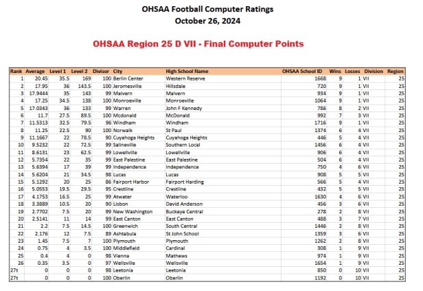 COLUMBUS, Ohio – As a direct request from the Ohio High School Football Coaches Association Tournament Committee, and approved by the OHSAA Board of Directors, a new divisor is used to determine second level points that is based on the number of games that opponents have played to date. For each open date that an opponent has had to date, a smaller divisor is used to calculate second level points.