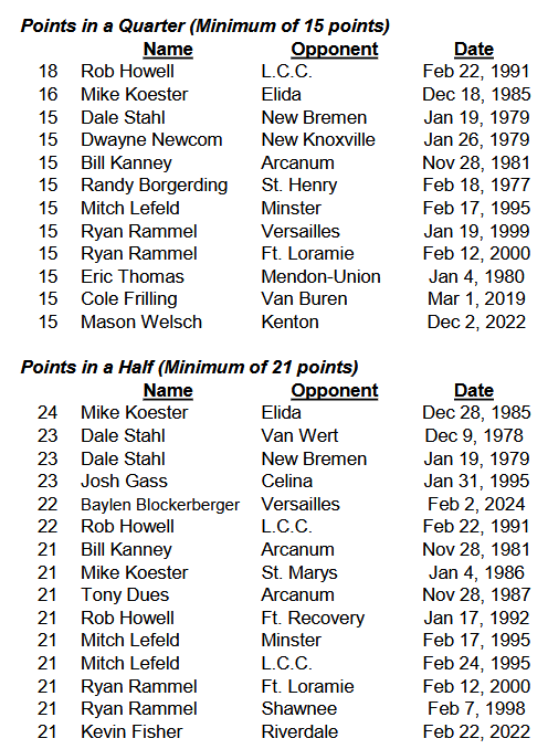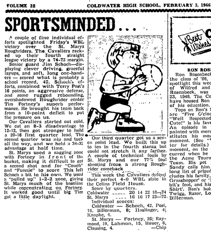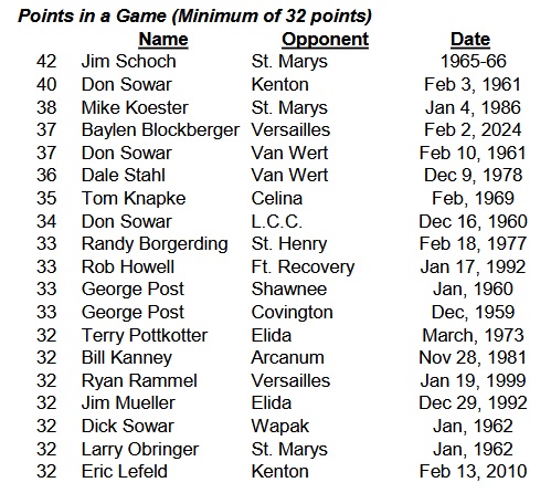 Blockberger’s performance last night broke a school record held by Jim Schoch that was set 59 years ago back in late January of 1966 when he scored 42 points against St. Marys in a 74-72 win. (Coldwater was in the WBL)