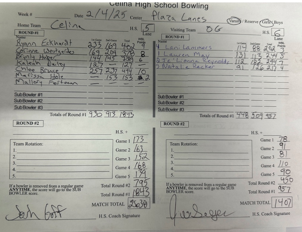 (2-5-25) The Celina Girls Bowling ended the regular season 14-1 (8-1 WBL) with a win over O-G at the Plaza Lanes last night 2638-1407.
