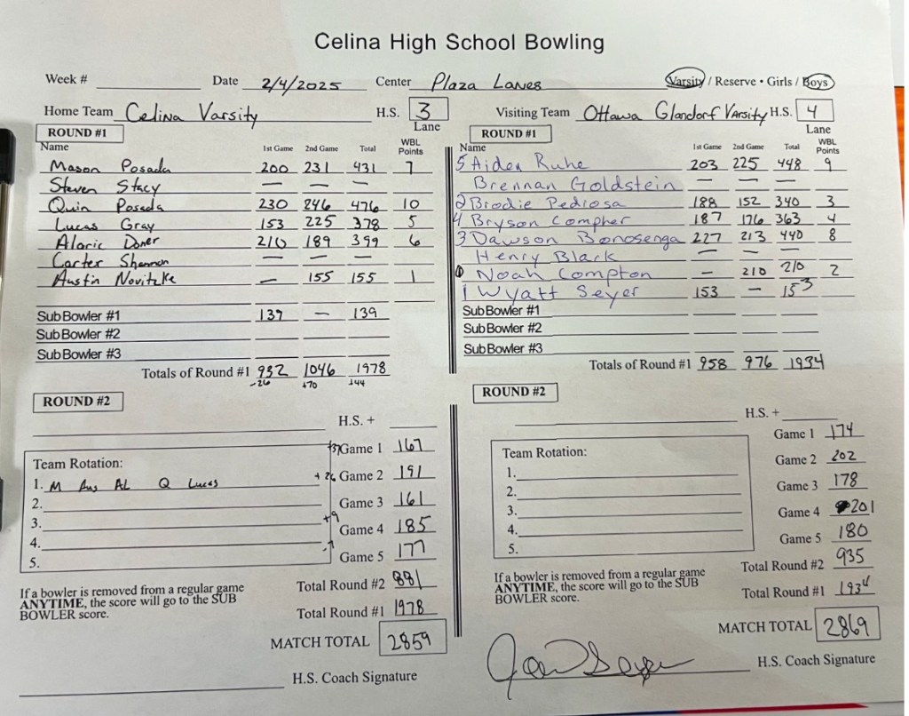 The Celina Boys to Ottawa Glandorf by just 10 pins 2859-2869. The Bulldogs were led by Senior Quin Posada with a High Game of 246 and a High Series of 476. Other High Games were Mason Posada 231, Lucas Gray 225 and Alaric Doner 210.