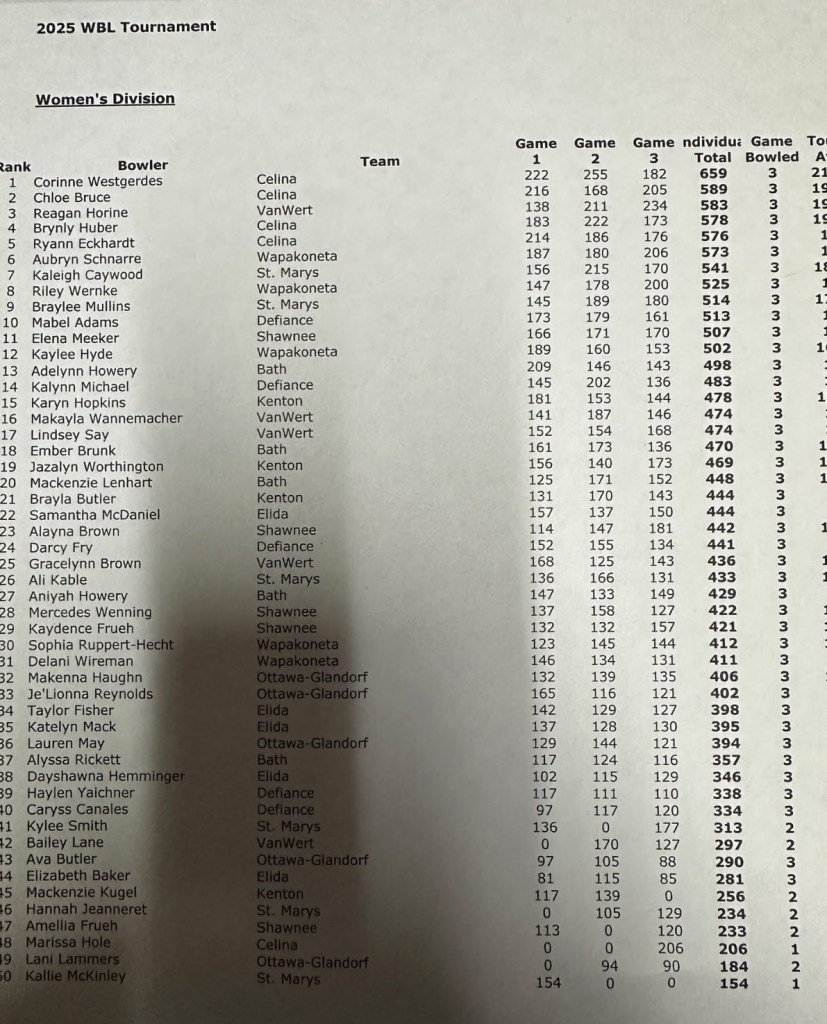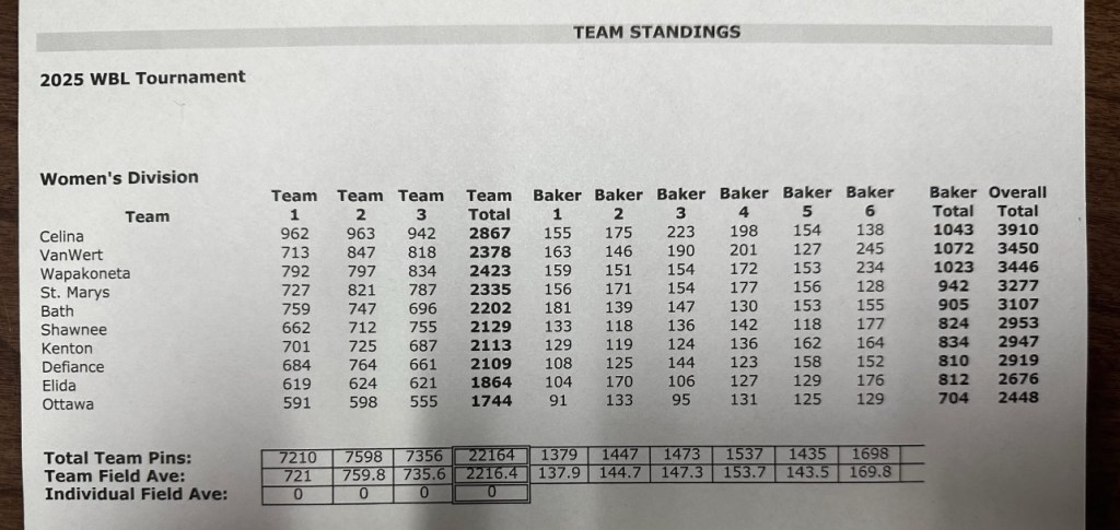 The Bulldogs had a 460 pin lead over second place Van Wert…with St. Marys finishing 4th, Celina finished as the WBL season as outright conference champions.