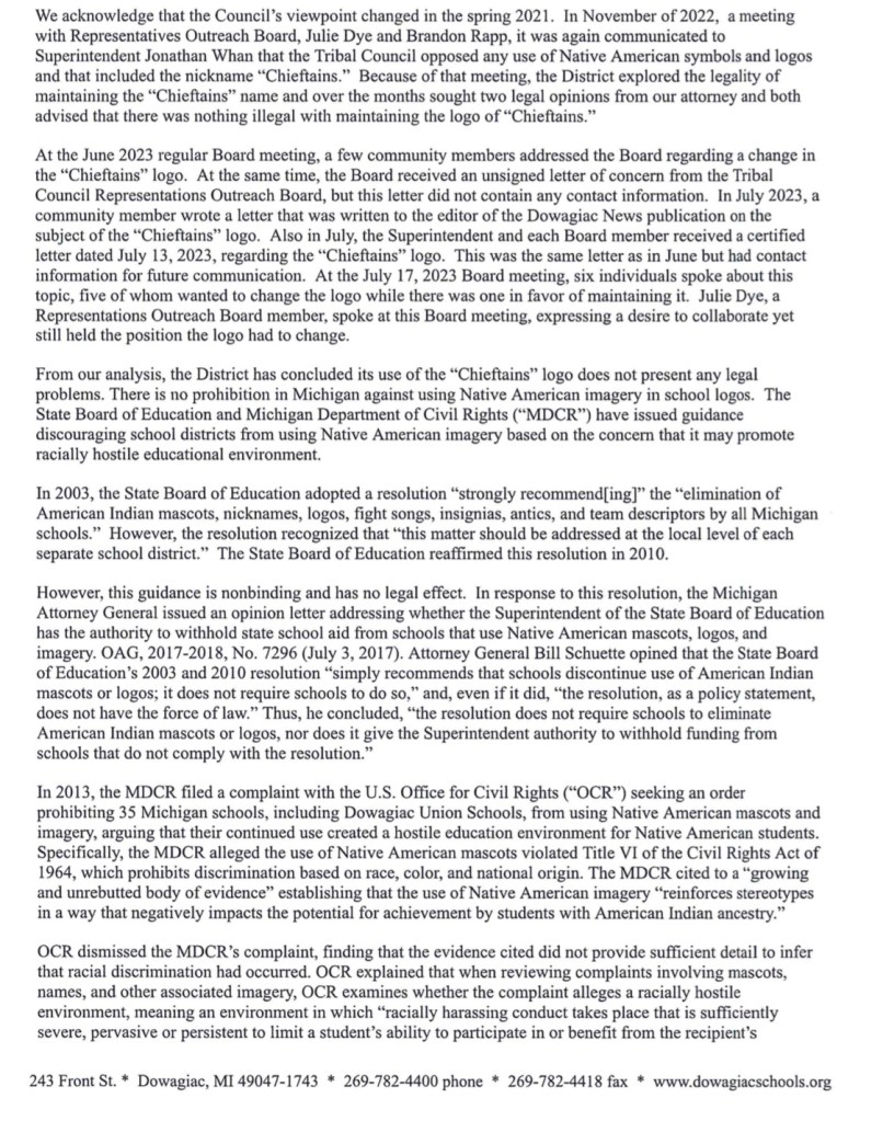 In October of 2023 the Pokagon Band announced it intended to rescind a resolution from 1990 that approved the district’s usage of the name “Chieftains.” The Dowagiac school adminstrators decided to keep the name and the logo…last week the matter came up again at the (You Tube video below) Dowagiac Union School Board of Education Meeting.