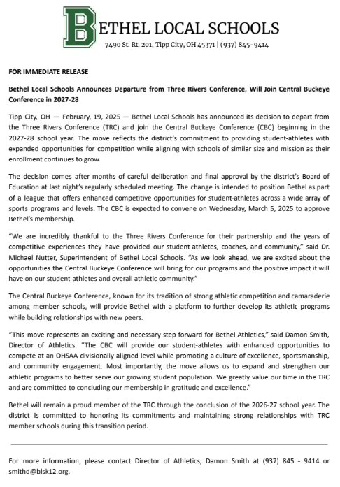(2-19-25) Bethel announced today that they are leaving the Three Rivers Conference to join the Central Buckeye Conference in 2027-28.