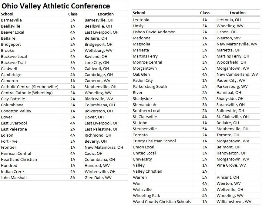 Schools in the OVAC are divided into different classes based on the enrollment of eligible athletes, ranging from Class A (smallest) to Class AAAAA (largest). Some well-known leagues within or related to the OVAC include the Buckeye 8 Athletic League, East Central Ohio League, and Eastern Ohio Athletic Conference.