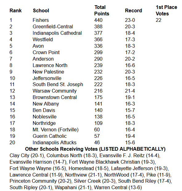 The rest of the Top 5 includes #2 Greenfield-Central (20-3), #3 Indianapolis Cathedral (18-4) and #5 Avon (18-3).