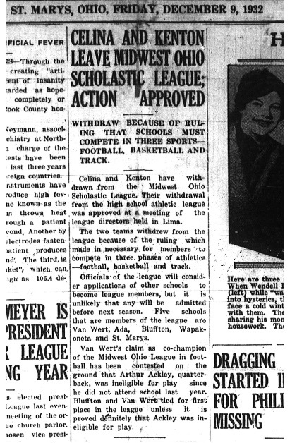 In 1932 Celina and Kenton announced that they were both leaving the league, another name variation appeared in this story….Midwest Ohio Scholastic League. They left because of a league ruling that all members had to compete in football, basketball and track. The remaining members at this time included Van Wert, Ada, Bluffton, Wapakoneta and St. Marys.