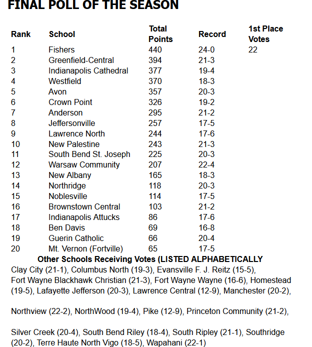The rest of the Top 5 included, Greenfield-Central (21-3) , Indianapolis Cathedral (19-4) , Westfield (18-3) and Avon (20-3).