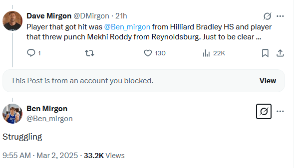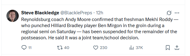 In a video that has gone viral a Reynoldsburg player can be seen punching a Hilliard Bradley (Ben Mirgon) player below the belt. The player was called for an intentional foul…but there is no evidence that the player received a technical foul, but he did remain in the game.