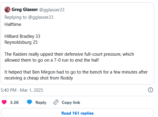 Hilliard Bradley and Reynoldsburg squared off in the Division I boys basketball district finals in Ohio on Saturday. Bradley led at the half 33-25. Reynoldsburg in the 2nd half would comeback from being behind to to win 57-51.