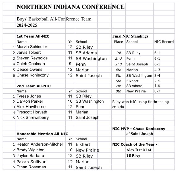 (3-10-25) The 2024-25 All-Northern Indiana Conference (NIC) Boys basketball team was named.