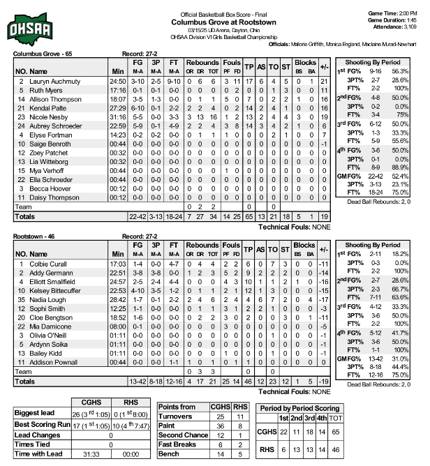 Columbus Grove used a 17-0 first-quarter run to take control of the contest early. A 3-2 lead just over a minute into the contest grew to a 20-2 margin over the course of six minutes. Columbus Grove made 7 of 11 shots and forced Rootstown into seven turnovers during the run.