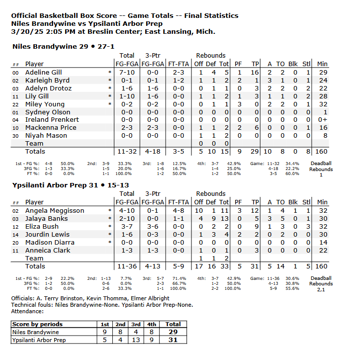 (3-20-25) Today in a Michigan High School Athletic Association Division 3 State Semifinal Girls Basketball game Brandywine lost to Ypsilanti Arbor Prep on two free throws with just 2 seconds remaining in the game 41-39.