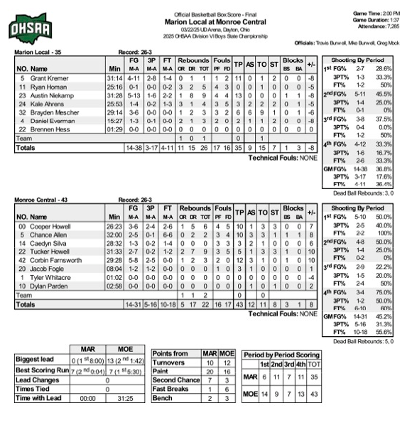 (3-22-25) Today at UD Arena in Dayton in a low scoring game that Monroe Central (26-3) controlled… the Seminoles would pick up a 43-35 win over Marion Local (26-3), to claim the first ever Ohio High School Athletic Association (OHSAA) D VI state title.