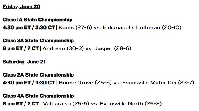 - Class 4A state championship – Crown Point 2 Center Grove 0 – 9 innings