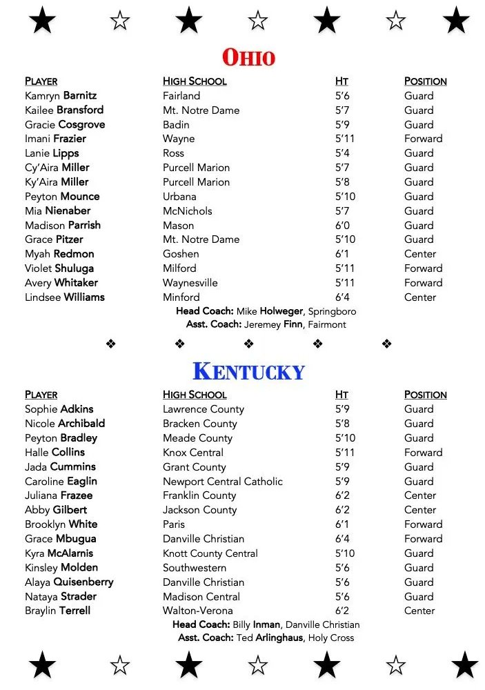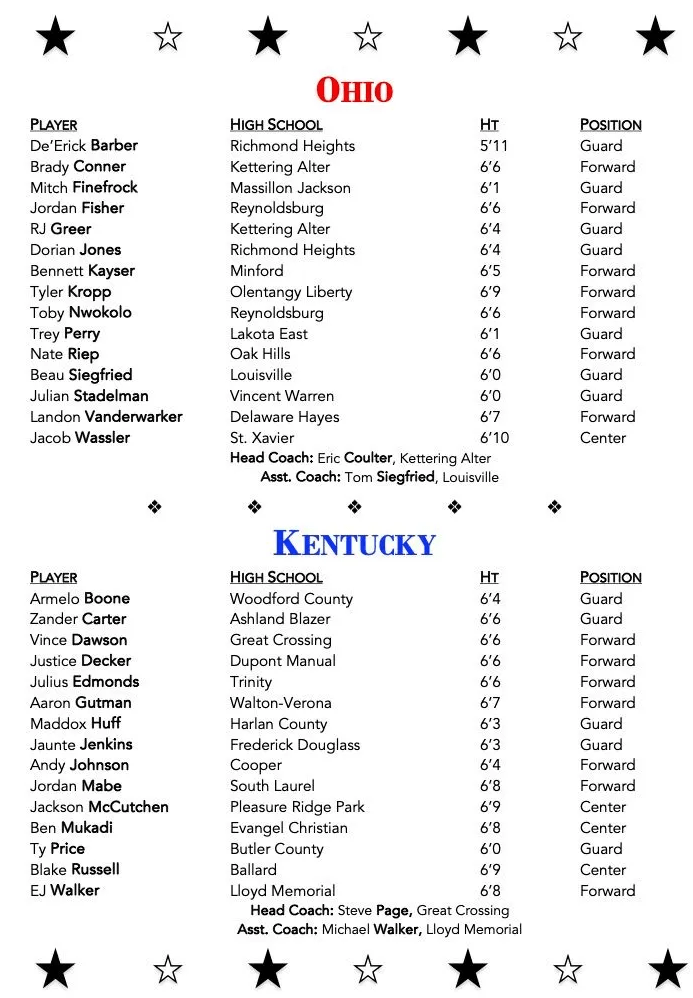 The Ohio Boys are led by Richmond Heights’ Dorian Jones and Alter’s RJ Greer. Jones was recently named the OHSBCA’s D V Player of the Year and Greer was named the D IV Player of the Year, he was also a finalist for Ohio’s Mr. Basketball.