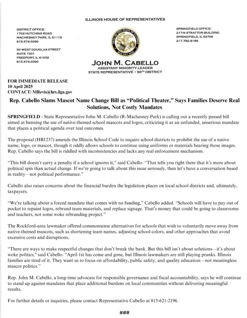 (4-19-25) State Senator Andrew Chesney (R-Freeport) and State Representative John Cabello (R-Machesney Park) are urging the Hononegah Community High School Board to join concerned parents and community members in taking a stand to reverse a shocking policy that allows a biological male to use the girls’ locker room.