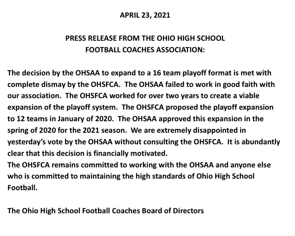 In 2021 it was announced by the OHSAA that there would be 16 qualifiers in each region…much to the dismay of the Ohio High School Football Coaches Association (OHSFCA).