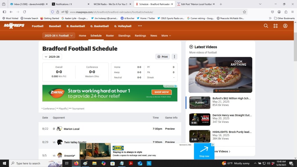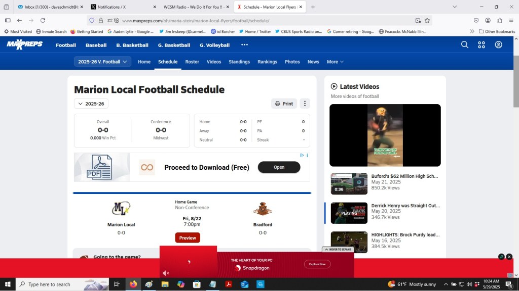 (5-29-25) According to MaxPreps on both the Marion Local and Bradford schedules….week two (8-29-25) the Railroaders will travel to Maria Stein to play the Flyers. Last year Bradford went 1-9 on the season, their only win of the season was over Dixie 7-6 who did not win a game last year.