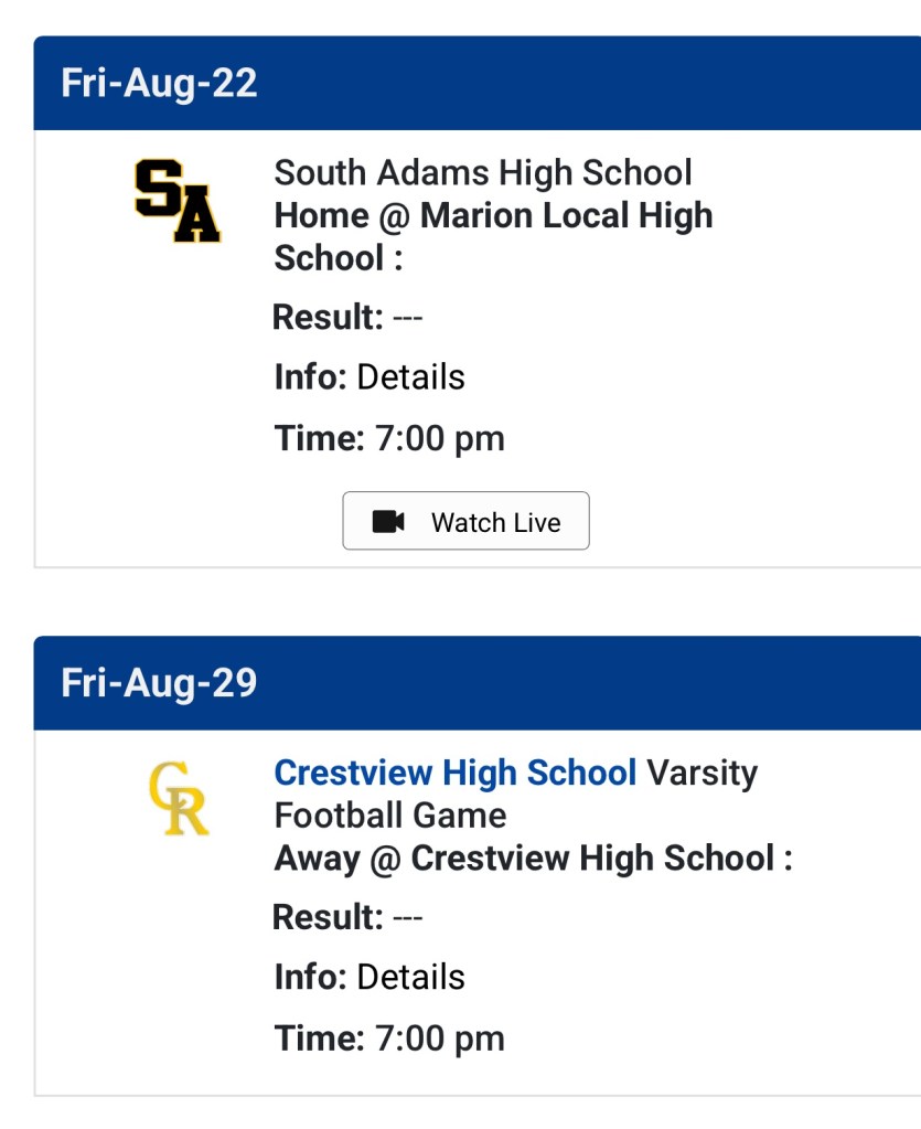 UPDATED: Thanks to vwindependent.com‘s Scott Truxell …who confirmed with Crestview coach….So week 2 Marion Local will play Crestview (Convoy), it is a 1-year deal. Crestview will then play another MAC powerhouse Minster the following two-years in a home and home deal.