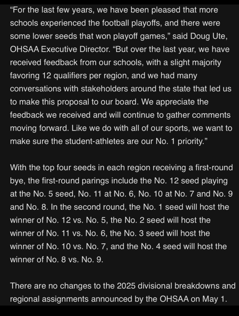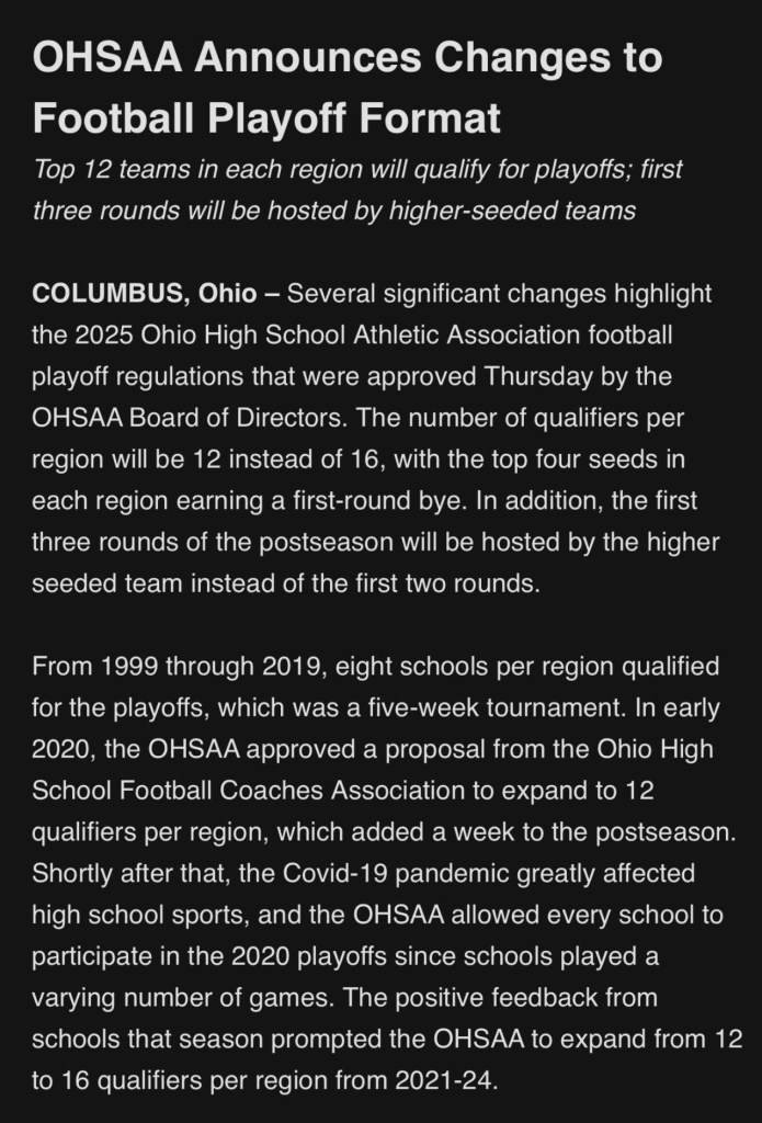 6-12-25 The OHSAA, thanks to some recent political pressure, has downsized Football playoff qualifiers in a region from 16 schools to 12 schools.