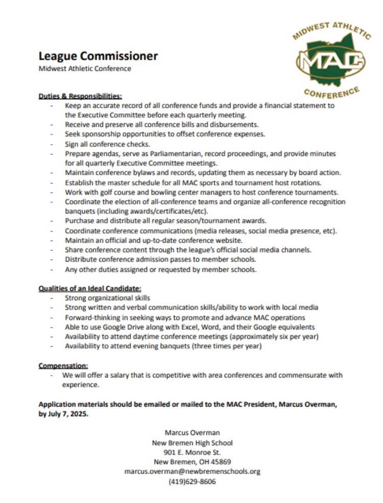 (6-17-25) After serving just one year Robb Hemmelgarn has stepped down as the Midwest Athletic Conference Commissioner. Minster announced that Hemmelgarn has been hired as the the school’s Athletic Director.