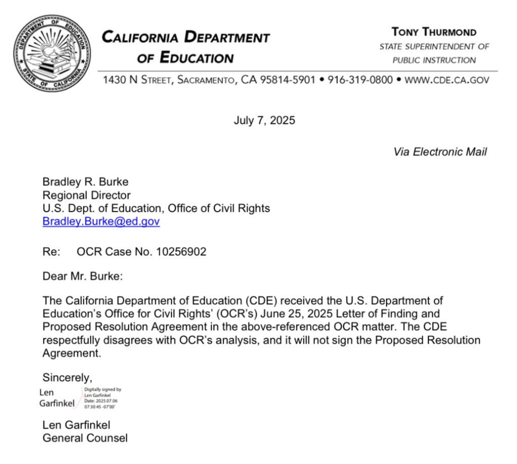 (7-7-25) The California Department of Education (CDE) and the California Interscholastic Federation (CIF) rejected the U.S. Education Department’s Office for Civil Rights’ (OCR) proposed resolution agreement following transgender athlete controversies in high school athletics over the course of the school year.