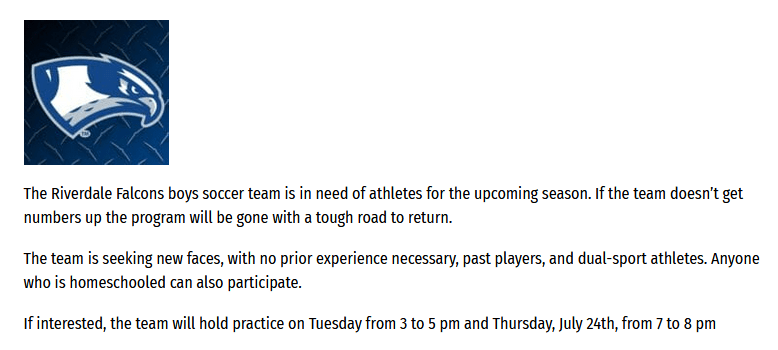 (7-22-25) Riverdale sent out a frantic notice this week that they need players for the boys soccer team….or the program will not play this season.