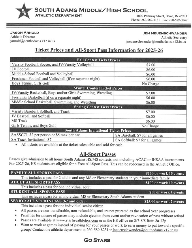 But thanks to Fear Powersports, Berne Ready Mix and Frank’s Quality Construction…all South Adams HS (for HS students only) students receive a FREE all-sport pass this year. A high school all-sports pass costs $50.