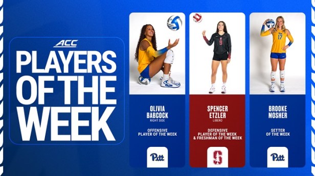 CHARLOTTE, N.C. (8-25-25) – Pitt junior right side hitter Olivia Babcock has been named the Atlantic Coast Conference Offensive Player of the Week, while Pitt redshirt senior Brooke Mosher is the ACC Setter of the Week for matches played during the opening weekend of the 2025 season. Additionally, Stanford’s Spencer Etzler was named both the ACC Defensive Player of the Week and the ACC Freshman of the Week.