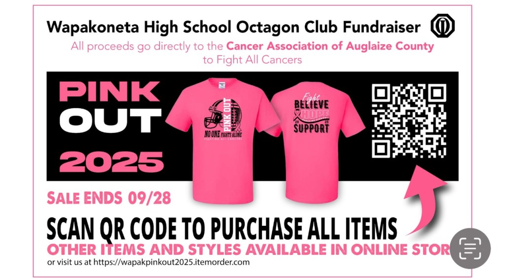 WAPAKONETA (8-29-25) — The Wapakoneta High School Octagon Club is proud to kick off its annual Pink Out T-Shirt Fundraiser, supporting the 2025 Pink Out Game and raising vital funds for local families impacted by cancer.